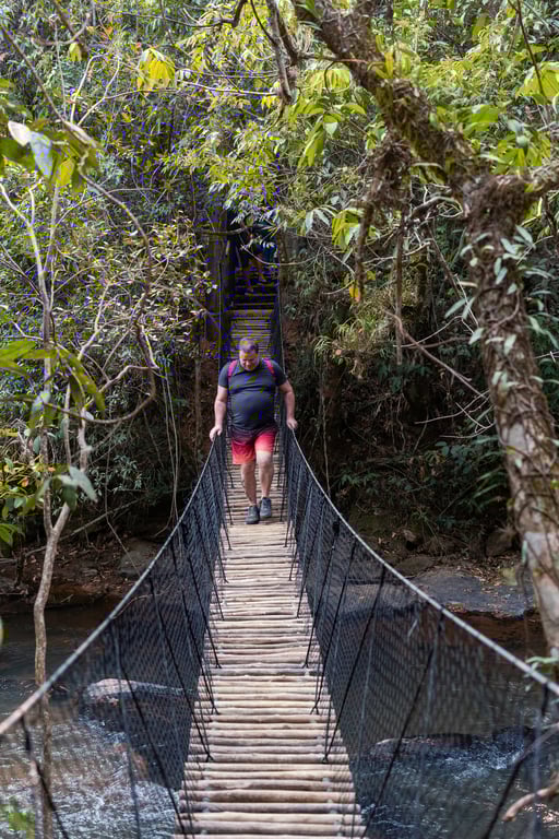 A Trilha está repleta de lindas paisagens de natureza, matas e queda d’agua. O acesso até as pequenas ilhas são por pontes suspensas. Entre os pontos de parada, inclui a Ilha das Orquídeas e a famosa corredeira do Monjolinho, onde é possível se banhar, escorregar nas quedas d’agua, flutuar, nadar, escorregar de bóia e apreciar o som das corredeiras, ideal para se conectar com a natureza e lavar a alma! A parada para banho é sazonal. Cenários lindos pra tirar fotos!